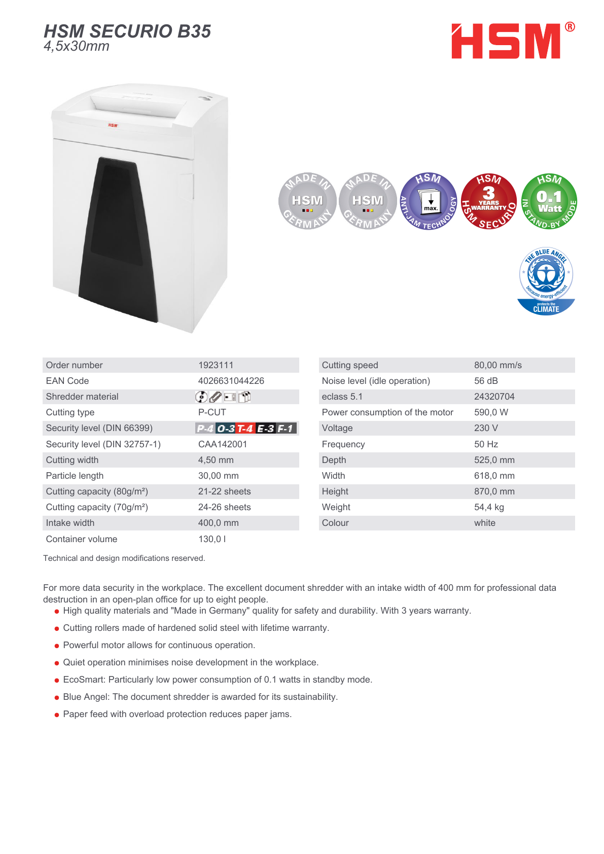 隱密士HSM SECURIO B35 ( Shred size 4.5x30mm) 小型碎紙機 每次25張 130公升紙箱容量 (德國製造)