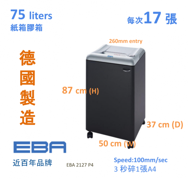 Motor capacity: 580 watt (高質量耐用馬達 ,連續碎紙時間較國產機長)