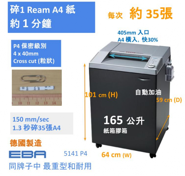 - Machine Class 機器級別: EBA 最重型碎紙機 - Security Level 保密級別 :DIN77399: P4 - Band & Model 型號: EBA 5141 型碎紙機新機參考價約 $ 30,000 - Shred capacity: 每次碎紙張數 : 約 35 張 (80gsm) - Paper Entry 紙張入口 : 405 mm - 碎紙速度: 約 150 mm/sec ( 1.3 秒碎一張A4紙橫入) (約 1 分鐘碎完 1 ream紙/500張 - Shred size 紙屑尺吋: 長條狀 (5.8mm) 紙箱容量: 約 210 公升 liters - Can Shred: 萬字夾 (包括大萬字夾),釘書釘,信用