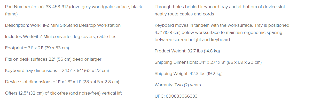 Make your workspace work for you with the all-new WorkFit-Z Mini standing desk. This compact sit-to-stand converter turns your current tabletop into a height-adjustable standing desk. The modern grey woodgrain finish fits your office decor and the technology you love—single monitors, tablets or laptops. Best of all, out-of-the-box set-up is as easy as 1-2-Z.