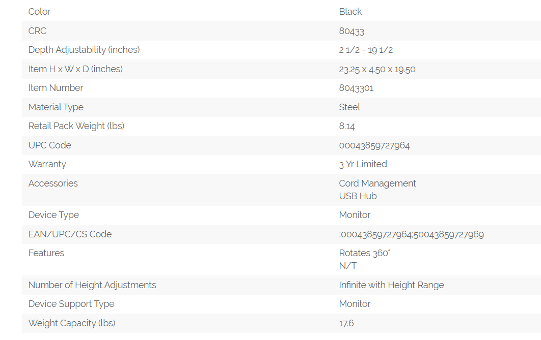 Supports one (1) monitor: up to 17.6 lbs. and 32 inches