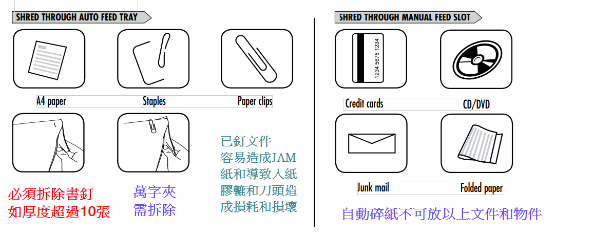 購買注意: 自動送紙器碎紙是須拆釘書釘和萬字夾 (已釘厚度超過10頁) ,會導致JAM 紙情況,也會因紙質和不同大小等問題而導致JAM 紙, - 需然可連續碎紙,但絕不適合作大量碎紙用途。會導致刀頭零件快速損耗而須要更換零件費用 (保養期也不包