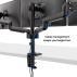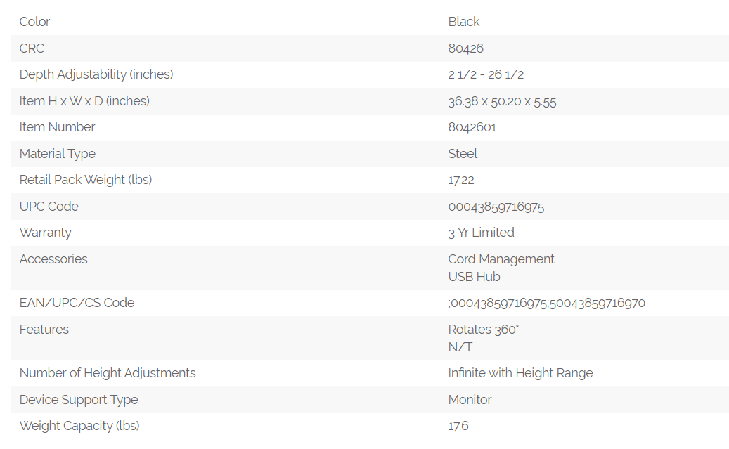 Platinum Series Triple Monitor Arm features three fully independent adjustable monitor arms for the ideal positioning of your monitors. Innovative gas-spring technology allows effortless monitor adjustment. Intuitive cord-management system helps minimize clutter. Two USB ports located at the base of the product make it easy to connect your favorite devices. Monitor arms are easy to mount. Use a clamp or grommet. Each arm holds a monitor up to 20 lb. It meets VESA mounting standards.