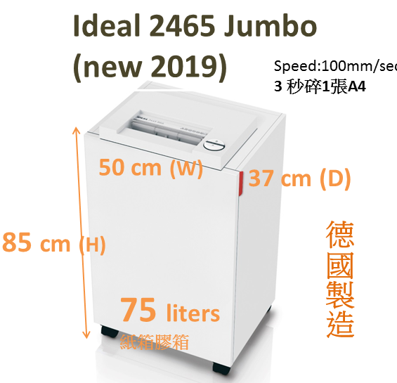 Ideal 2465 出左部新Jumbo 形號 這是Ideal 2465 的加大板,碎紙機頭是原用 Ideal 2465 ,所以碎紙能力和功能是原全一樣,但配了一個大容量的機箱,由35 litres 升級為 75 litres,可裝多一倍紙屑, 好處是可節省清紙屑的頻率和時間,但體積就要預多小小位,