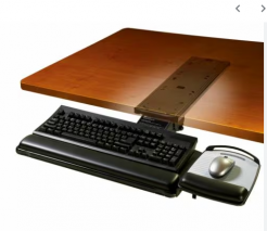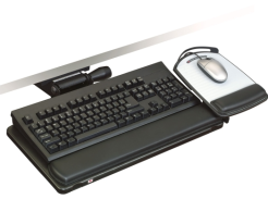 - Mouse tray mounts to right or left side of keyboard tray or stows underneath