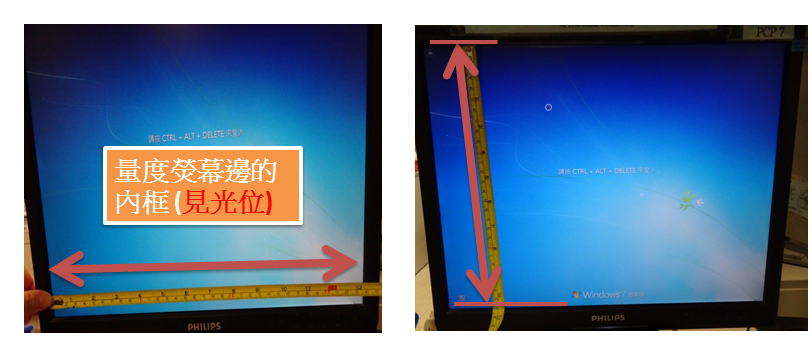 量度內框可視區(見光位)的寬度及高度,不要計算黑邊框(如上圖),要精確度為mm為單位。