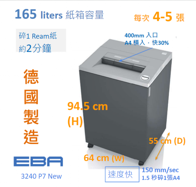 EBA 3240ccc 0.8x5mm (P-7 保密) 粒狀重型碎紙機 每次4-5張 容量165公升 A3入口(400mm) (德國製造)-(Replaced EBA 3140)
