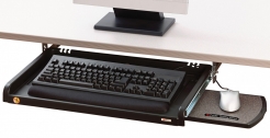 - Mouse tray mounts to right or left side of keyboard tray or stows underneath